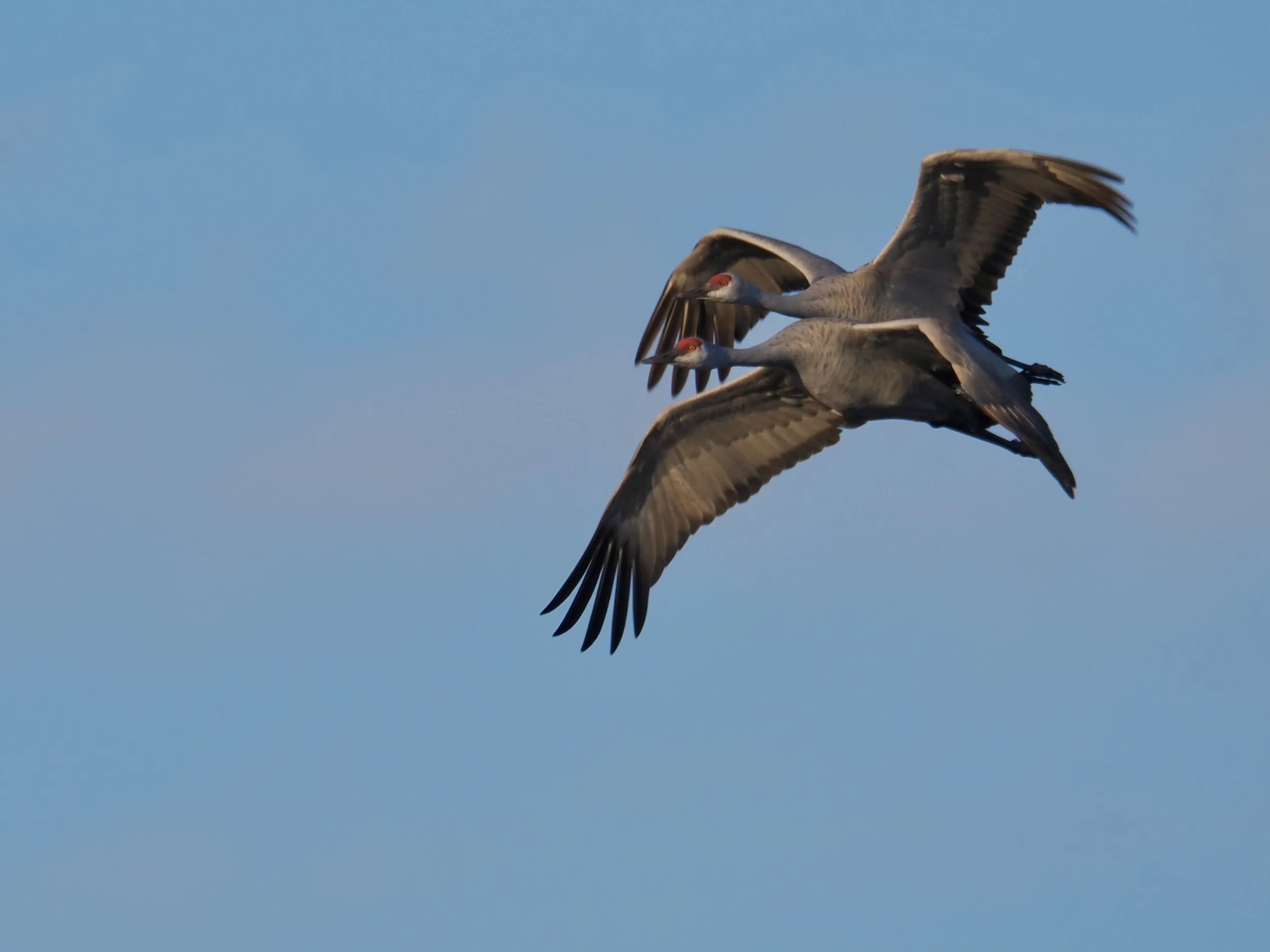 Sandhill Cranes roost overnight in the refuge ponds to stay safe from predators and then fly out at sunrise to feed in nearby agricultural fields, returning again at sunset. I arrived at Pixley NWR just in time for the morning flyout and later managed to find them feeding in the fields. They usually roost in the inner ponds far from footpaths, so getting a good view is tough until they take to the air. Thankfully, they flew toward me instead of away.