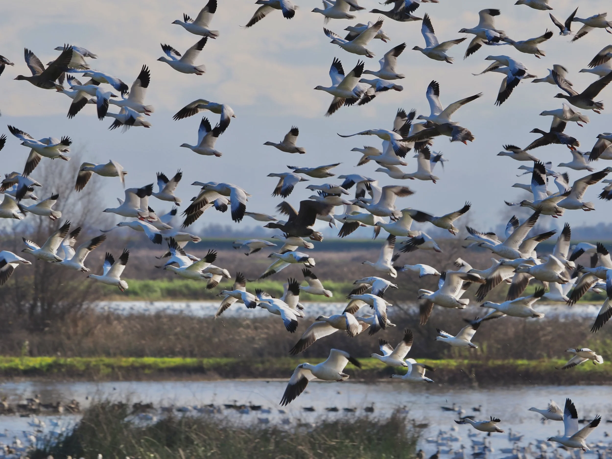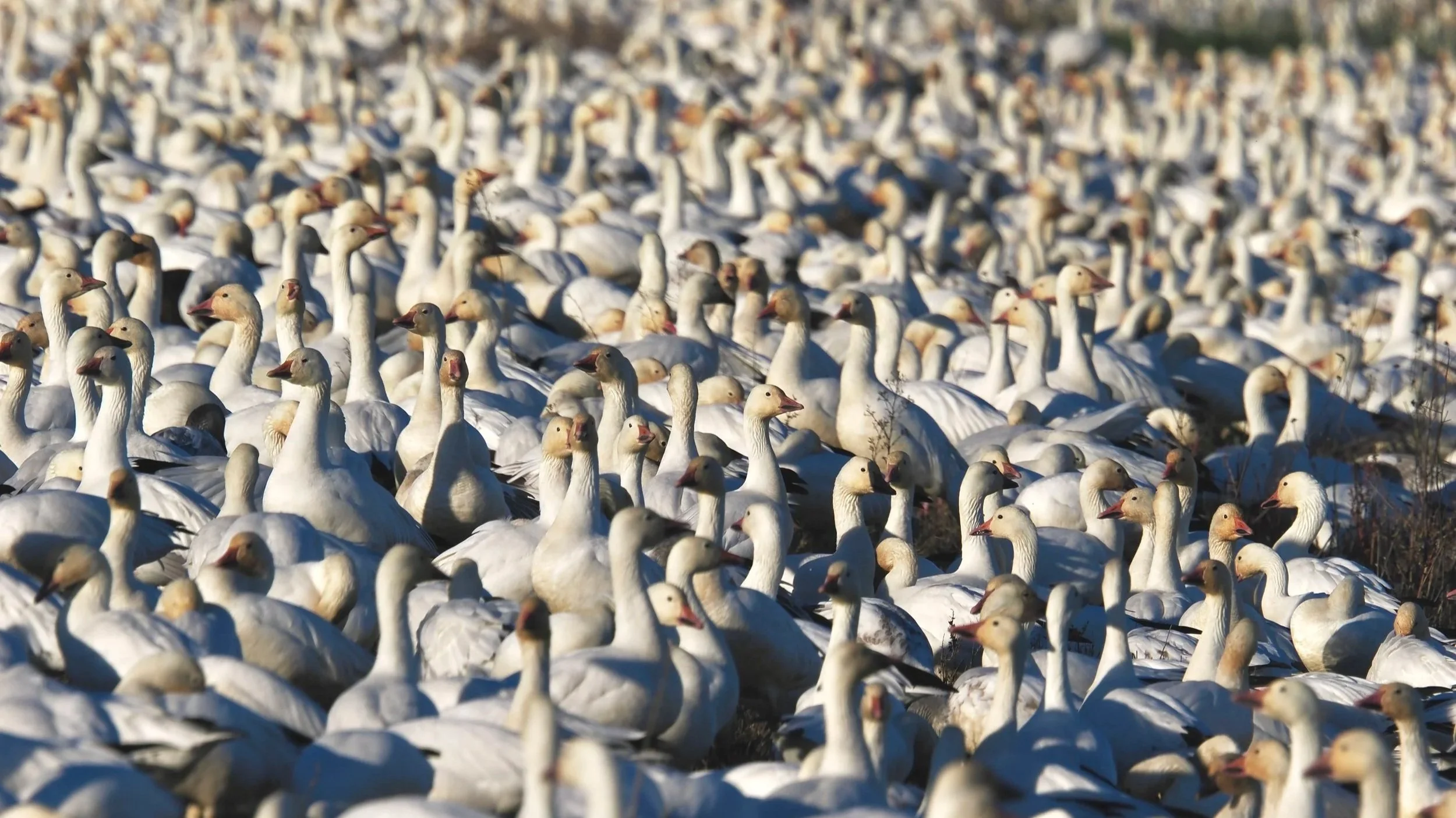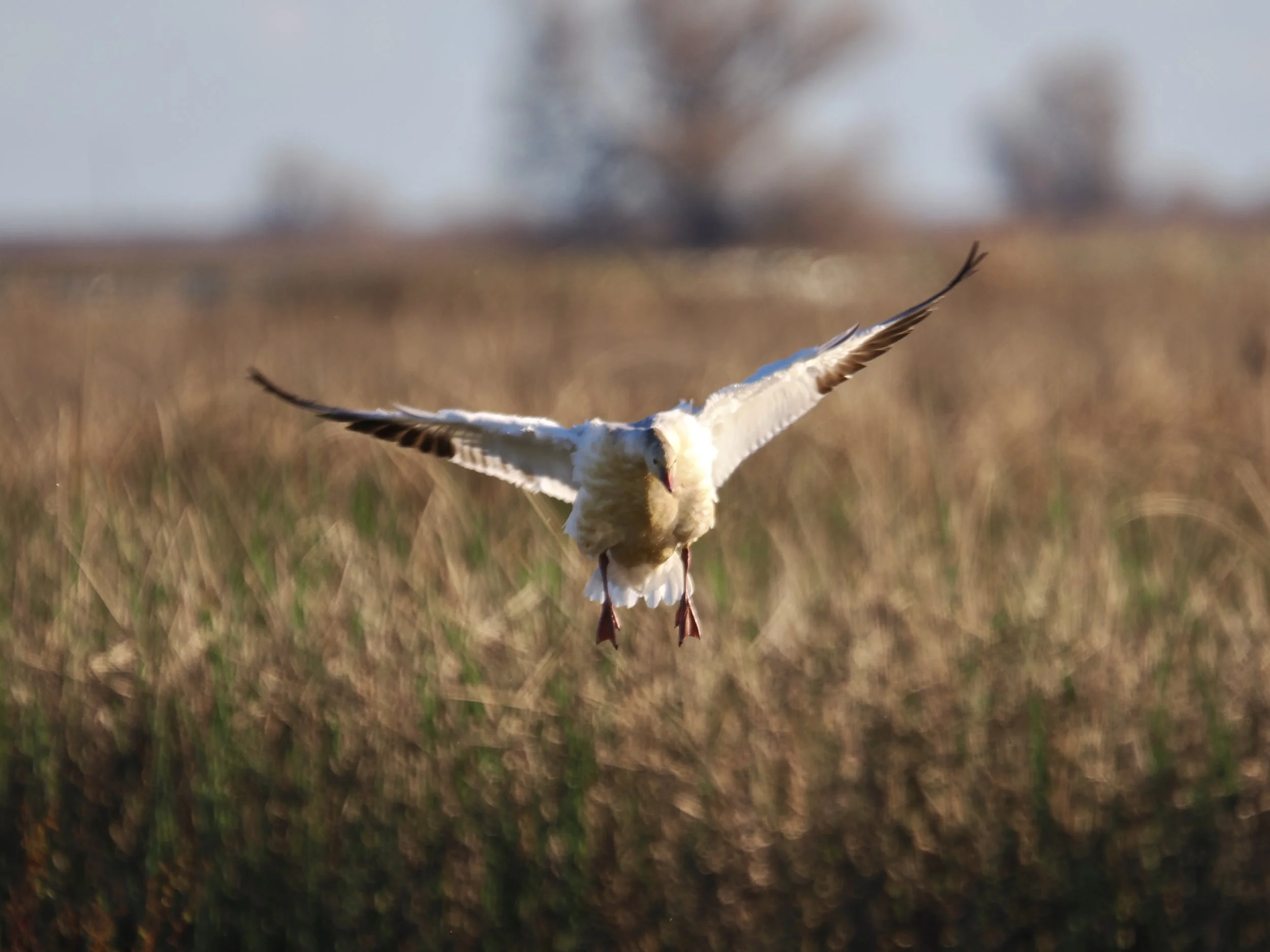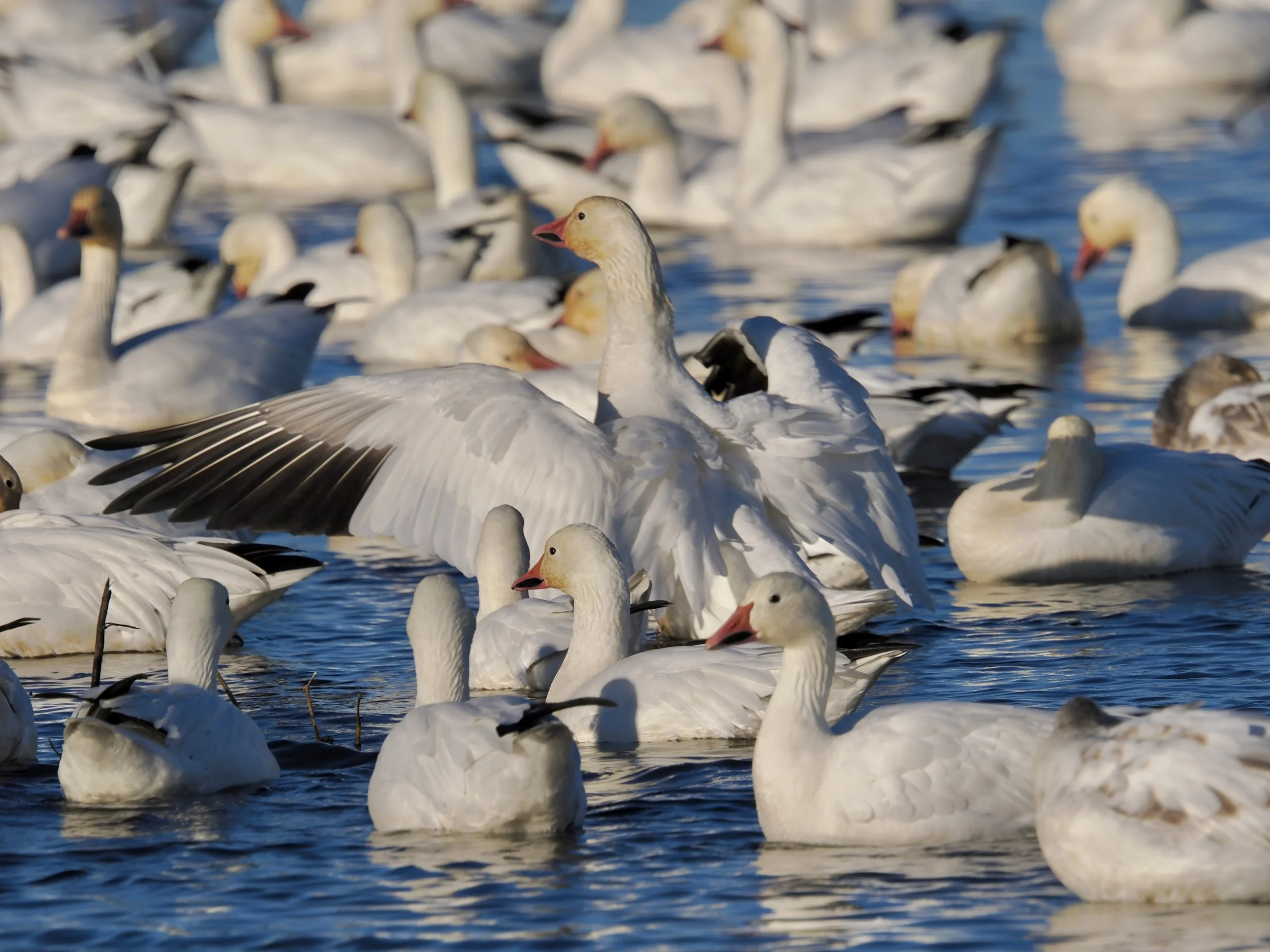 Merced NWR instantly shot to the top of my birding locations list. When I arrived, the ponds were covered in what looked like a sea of white, accompanied by the loudest honking I’ve ever experienced. Normally, waterfowl are extremely skittish and will flush the moment they see you when you’re over a mile away. But Merced has an auto-tour route, so the birds are more comfortable with vehicles and less wary as long as you stay in the vehicle. Large flocks were roosting close to the road, which made for some incredible views.